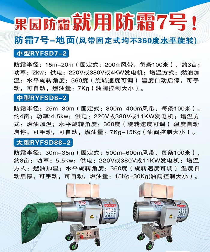 1.燃油高空款:防霜半徑≥50m;功率:10.5kw;安裝高度7米。☆增溫方式:逆溫層+燃油;水平旋轉(zhuǎn)角度:360度(旋轉(zhuǎn)速度可調(diào)節(jié));防霜機(jī)自動(dòng)上下擺動(dòng),擺動(dòng)角度和幅度均可自由調(diào)節(jié);不可有明火噴出防霜機(jī)出口;配有安全檢測(cè)裝置,當(dāng)火熄滅后供油系統(tǒng)自動(dòng)斷油;配有高空逆溫層測(cè)溫裝置和測(cè)地表溫度裝置;再有逆溫層時(shí)可以只開防霜機(jī),當(dāng)逆溫層消失時(shí)可開啟燃油裝置且可以調(diào)節(jié)大小火量。380V電源。